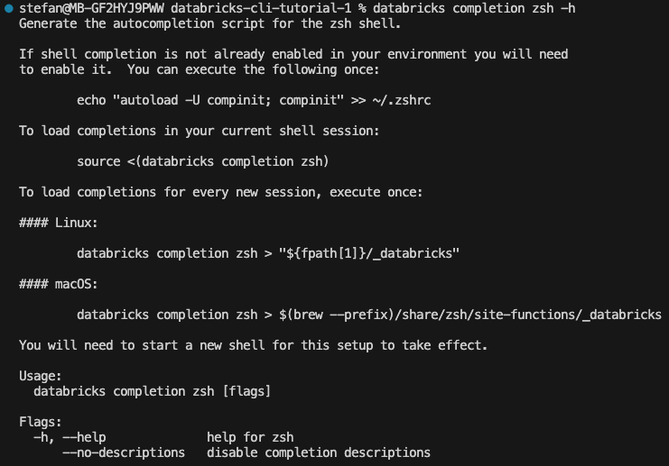 After the Databricks CLI has been installed, there is no auto-completion. This is very helpful as you can type in commands quickly and, above all, prevent typing errors. It is recommended to install it immediately. The installation is different depending on the terminal used. On my Mac, I work in VS Code with the Z Shell, abbreviated as zsh. There is currently completion for bash, fish, PowerShell, and zsh. This is documented in detail in the help: