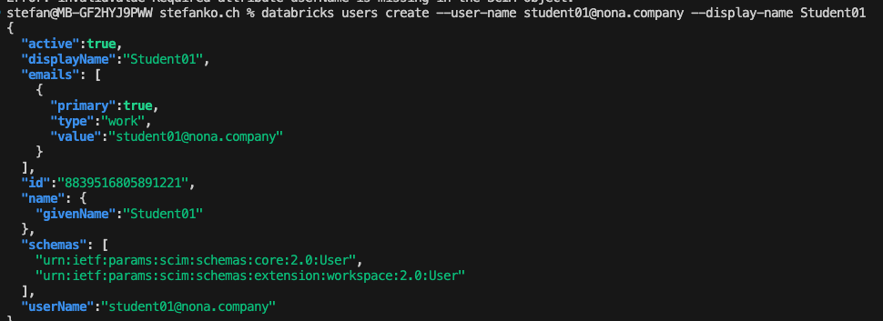 What is the best way to work with the Databricks CLI? The same way you work with other CLIs, such as the Azure CLI. You don’t need a mouse; you can do everything with the keyboard. Nevertheless, there are a few tips that make life a little easier. Let’s take the example of the 20 students again. I want to create these 20 students, and then I will execute several commands one after the other. In other words, I type the following command in the terminal:
