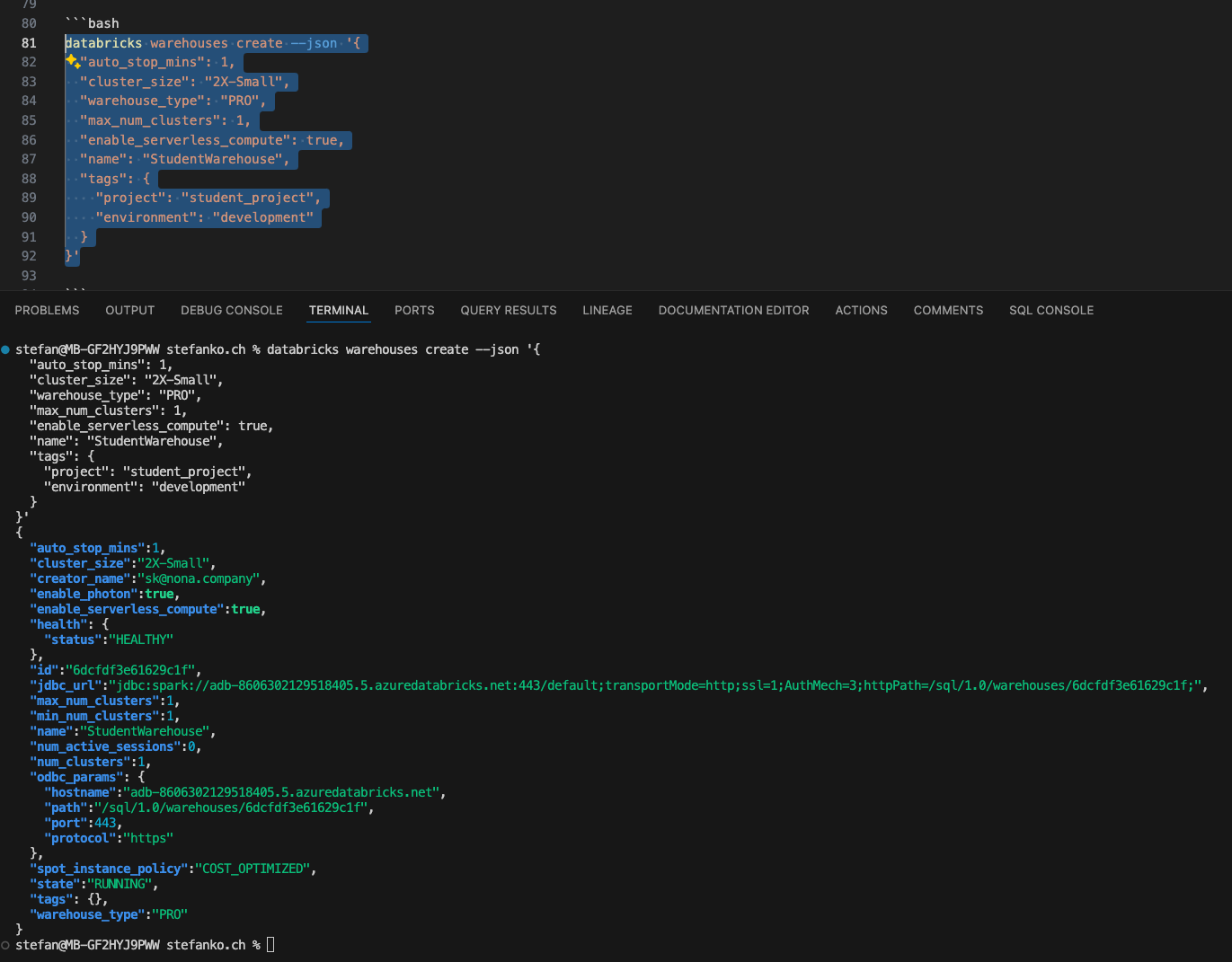 This is a legitimate question, as everything is already documented. This blog series aims to try out all the available commands. This way, I get to know the various possibilities. Hopefully, in the future, I will no longer implement one or the other tasks via the Workspace GUI but will increasingly use the Databricks CLI. I will also create sample queries. These should then be easy to copy, adapt, and use later.