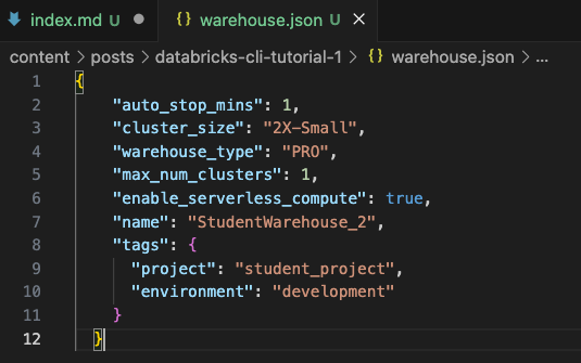 Instead of outputting the JSON in several lines in the terminal, you can also write the content in a JSON file and then output it with one line in the terminal. I will create a new JSON file and copy the previous content. I call the warehouse “StudentWarehouse_2”, and the file has the name warehouse.json: