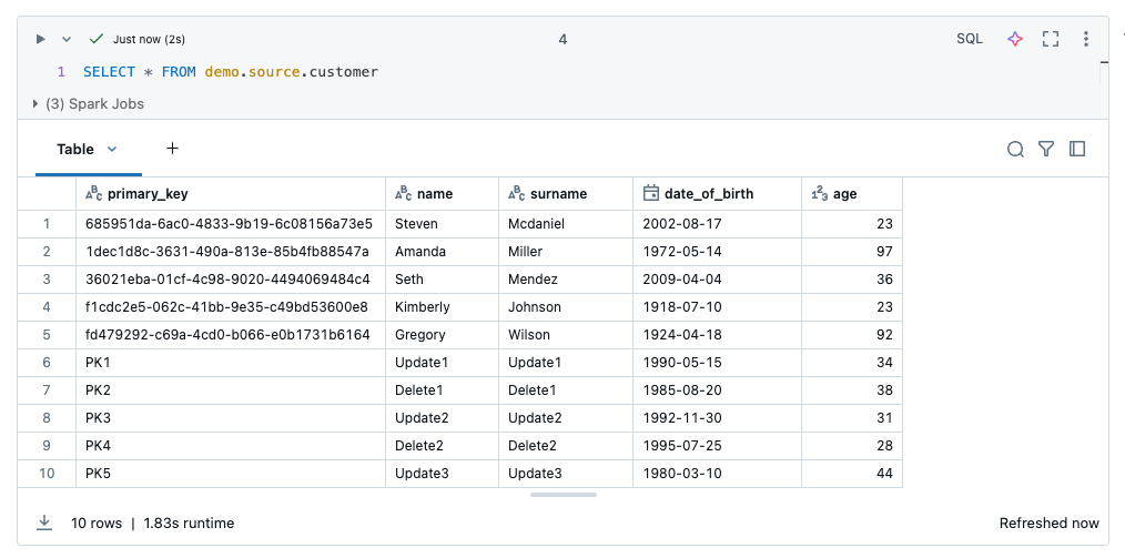 What we need here is the key with which the records can be compared, analogous to a merge statement. This can be a single column, such as the ‘primary_key’ column in my example. However, it can also be a list of columns if it is a composite key, i.e. a key that is made up of several columns.