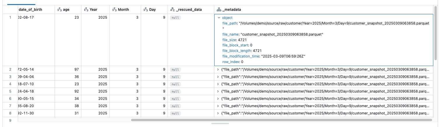 It has loaded all 10 rows from the Parquet file. The content of the Bronze table now looks like this: