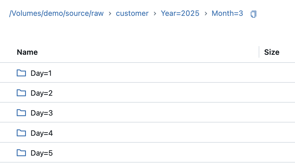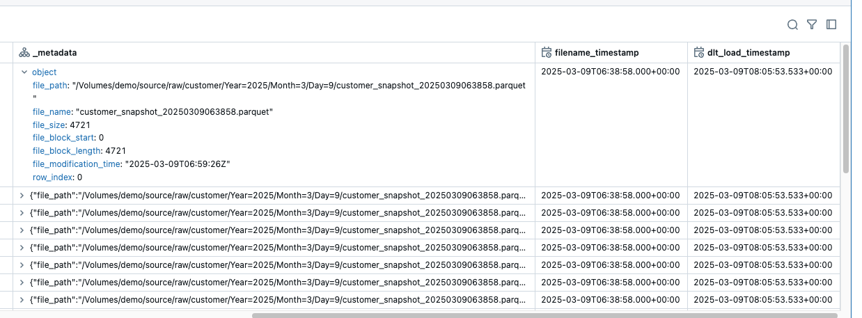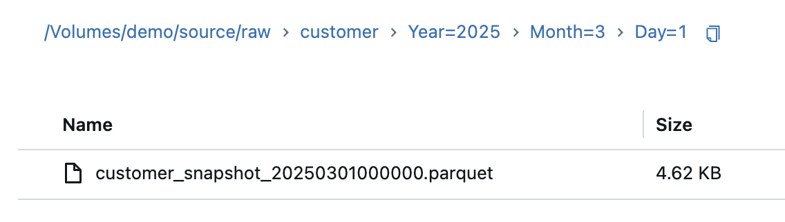 I will use Parquet as the file format for the snapshots. If I were to write this myself using the Spark method, it would generate a folder with several Parquet files, as Spark is optimised for parallelisation. With Pandas, I can write this as a single file, so I convert the PySpark dataframe into a Pandas dataframe. In addition, I create a partitioning in the target directory according to year, month and day, just as it would be done in practice. The current timestamp is entered as a string in the file name of the file so that the file name looks like this: customer_snapshot_20250301000000.parquet. This allows you to recognise later when a snapshot was created.