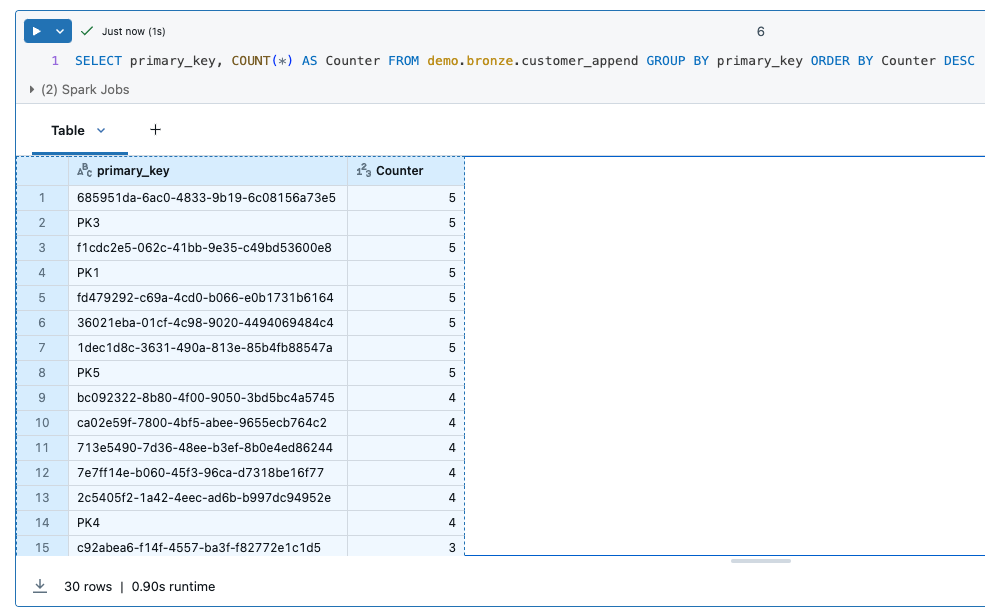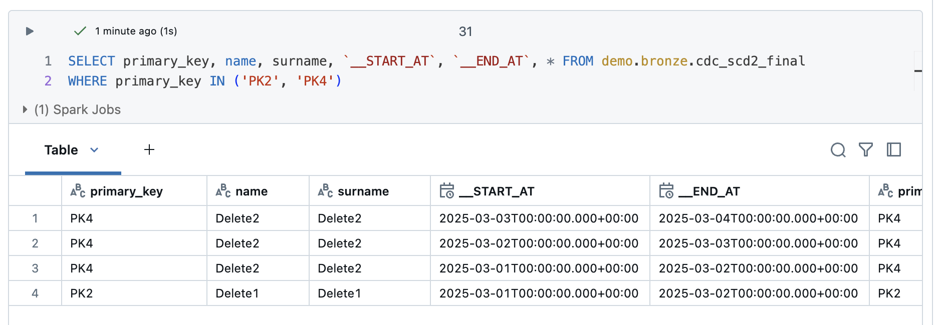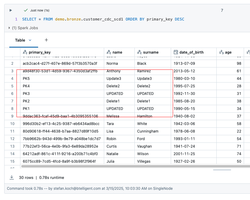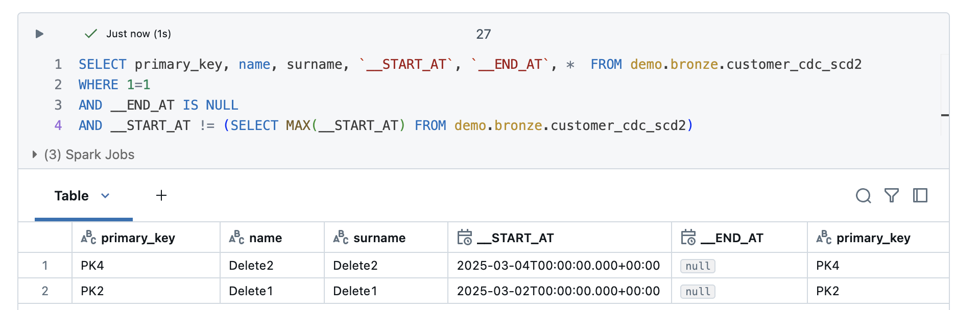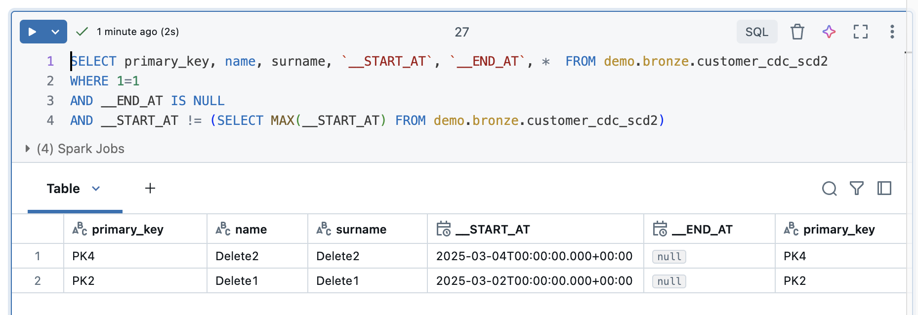 The table customer_cdc_scd1 has a total of 30 rows. You can see that the changes to PK1 and PK2 have been adopted, but the deletes have not been adopted. This means that PK2 and PK4 are still present in this table.