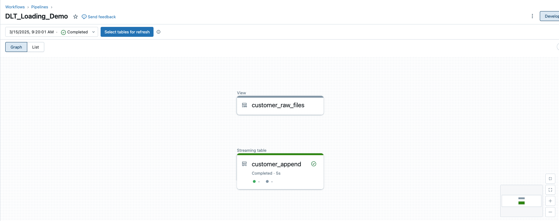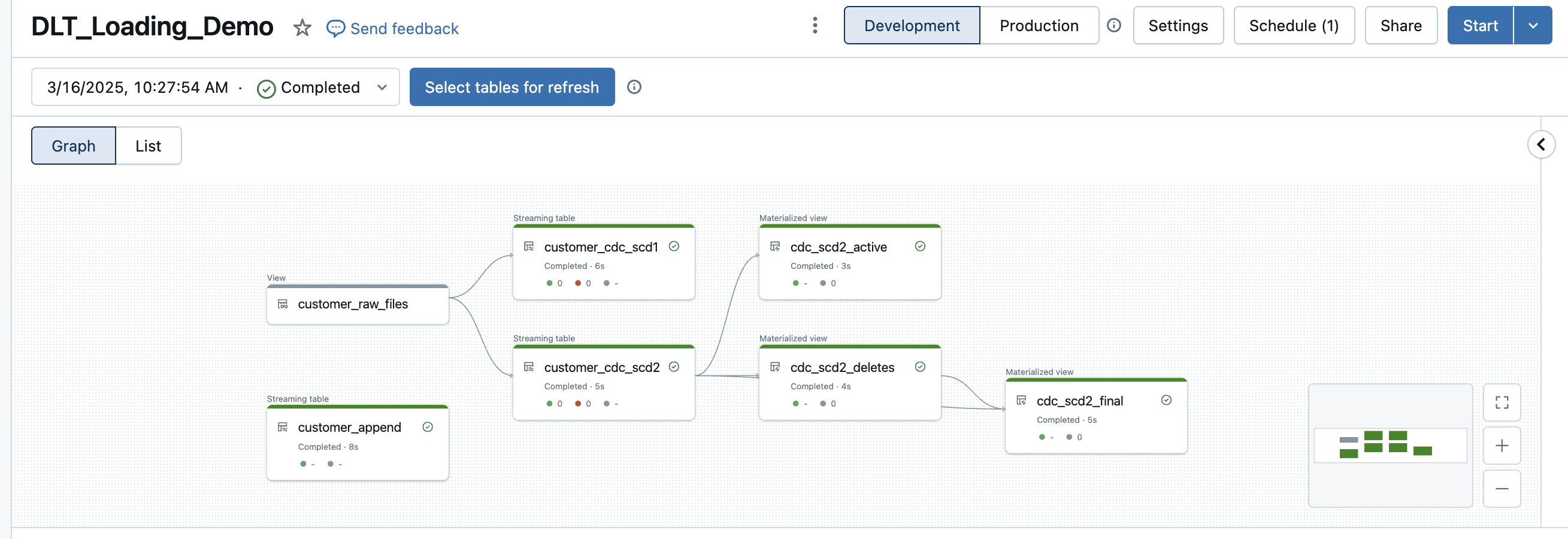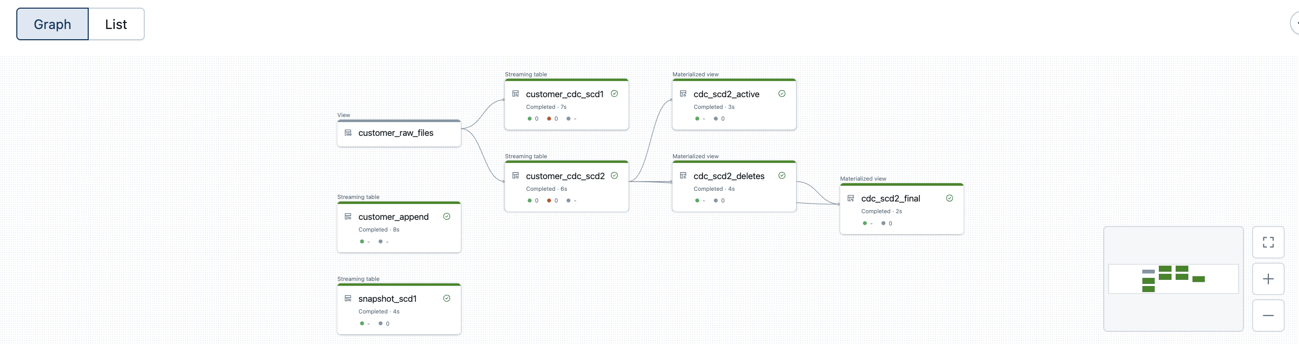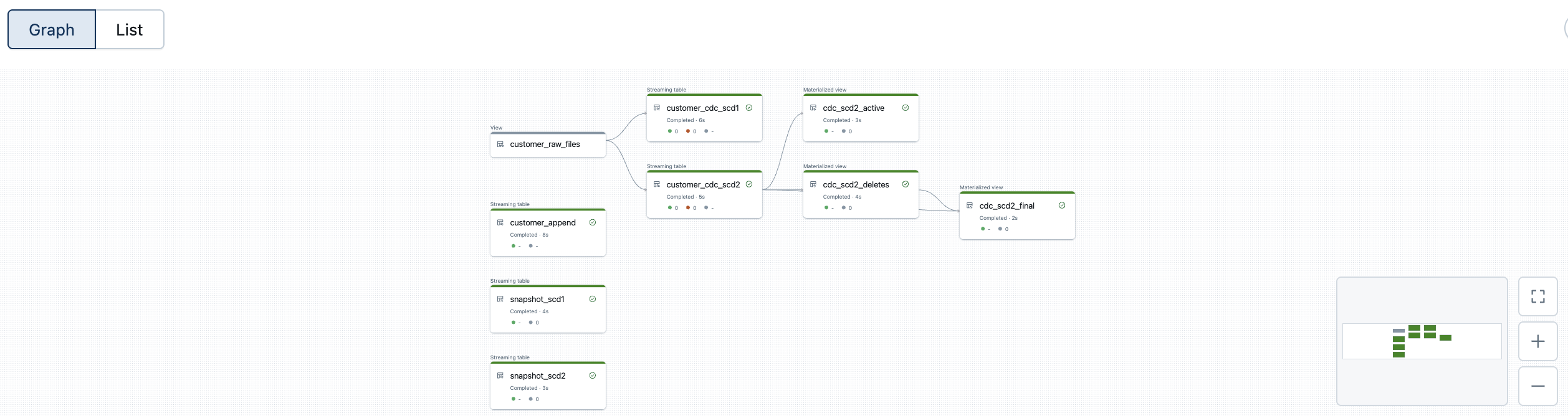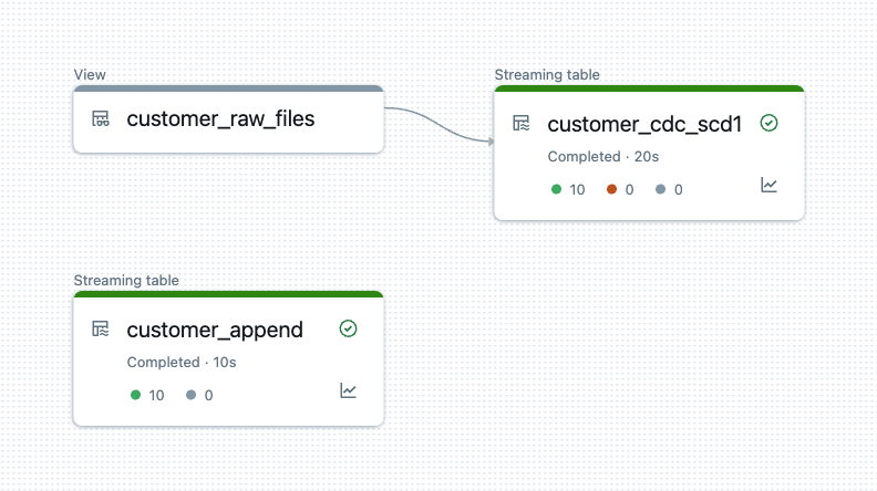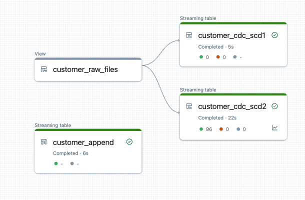 The generated DLT pipeline now looks like this. I use the same view customer_raw_files for both SCD1 and SCD2.