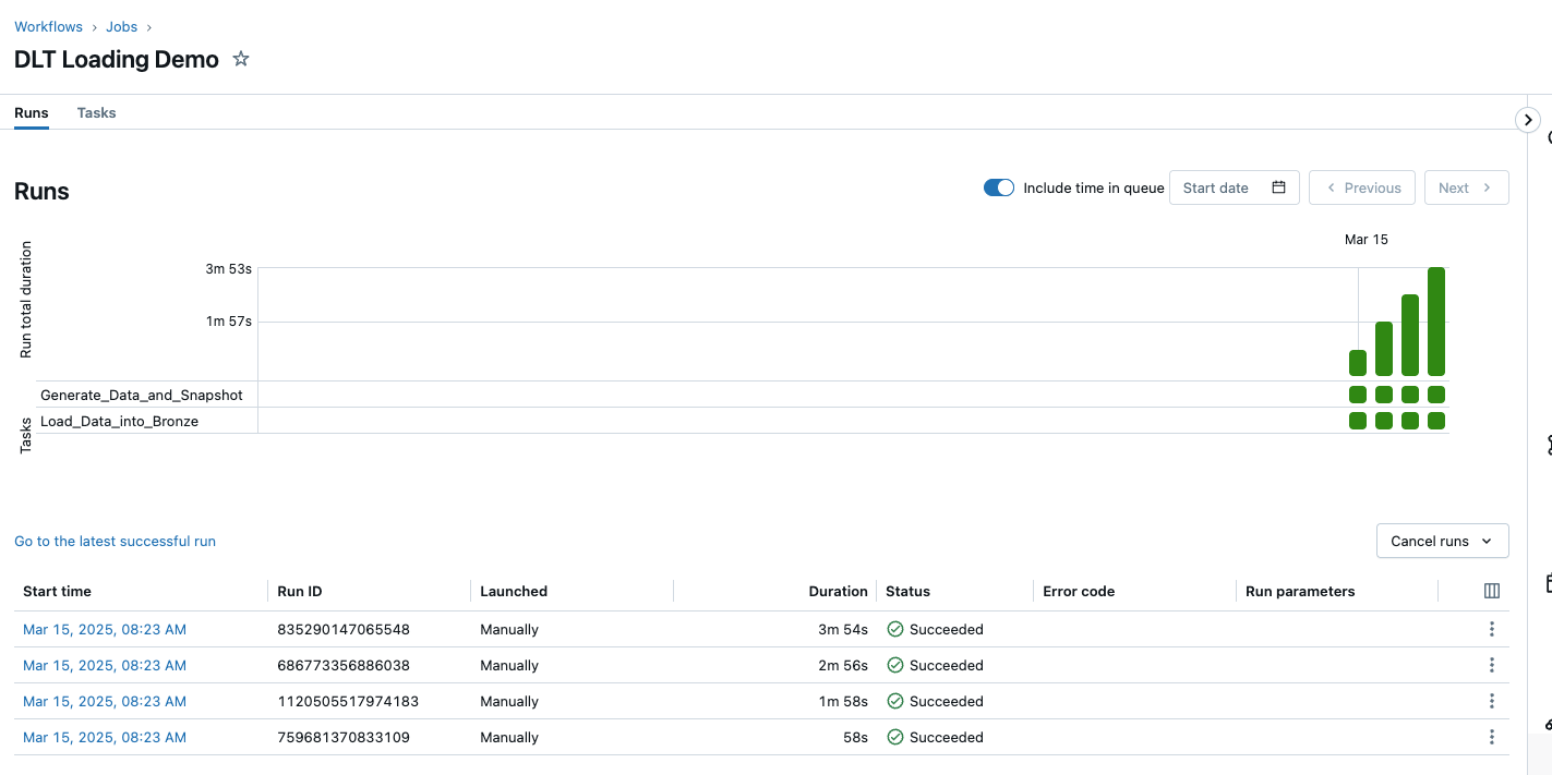 I now run the job 3 times in a row so that the data is generated and loaded immediately via DLT. But more about the timestamps and why they are important for the final solution later.