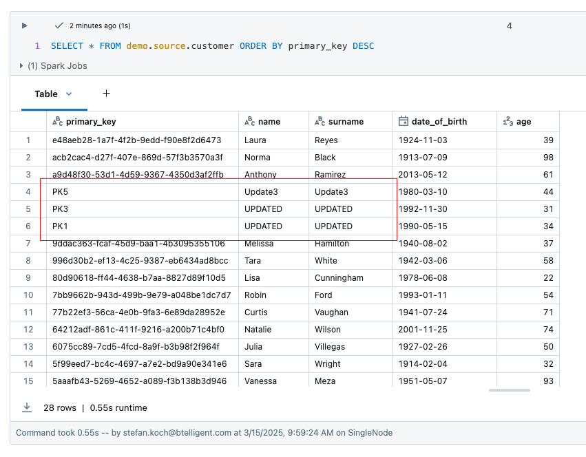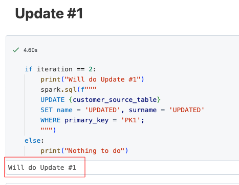As I described at the beginning, update and delete operations are also carried out in the notebook runs in addition to the inserts. The following is an extract from the update run.