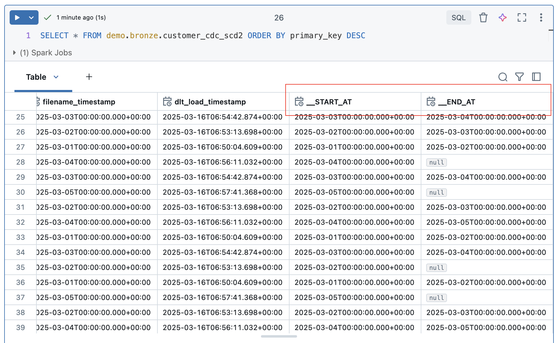 Now let’s take a look at the result of the table. After 5 runs, we have a total of 96 rows. As we are loading with SCD2, two additional columns START_AT and END_AT are added to the bronze table. These are used to define the validity of the rows. In other words, if a record has been deleted, it is not deleted from the Bronze Table, but the __END_AT date is set to indicate that it is no longer valid from the time of loading. During an update, the end time is also set and the new, changed value is added in a new row with a start date but without an end time. This means that all records that do not have an end time are valid values. So much for the theory…..