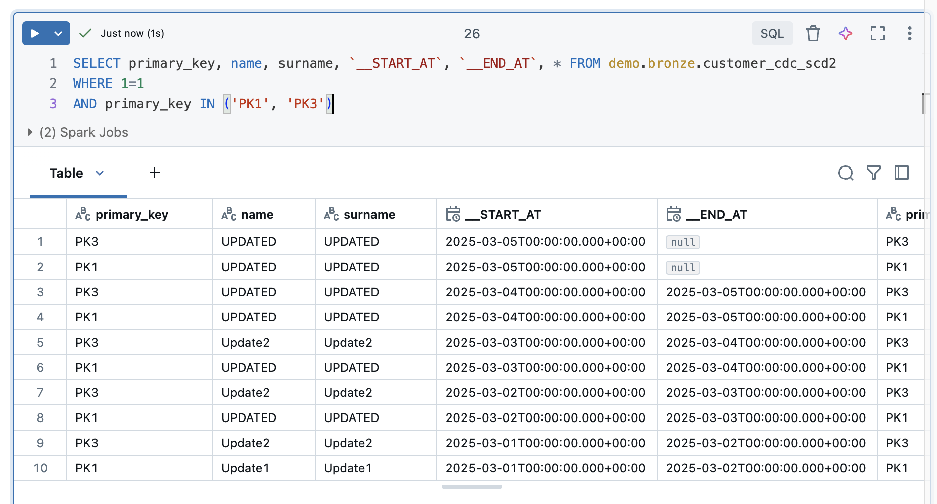 Let’s take a closer look at the rows that have been updated, i.e. the customers with the keys PK1 and PK3.