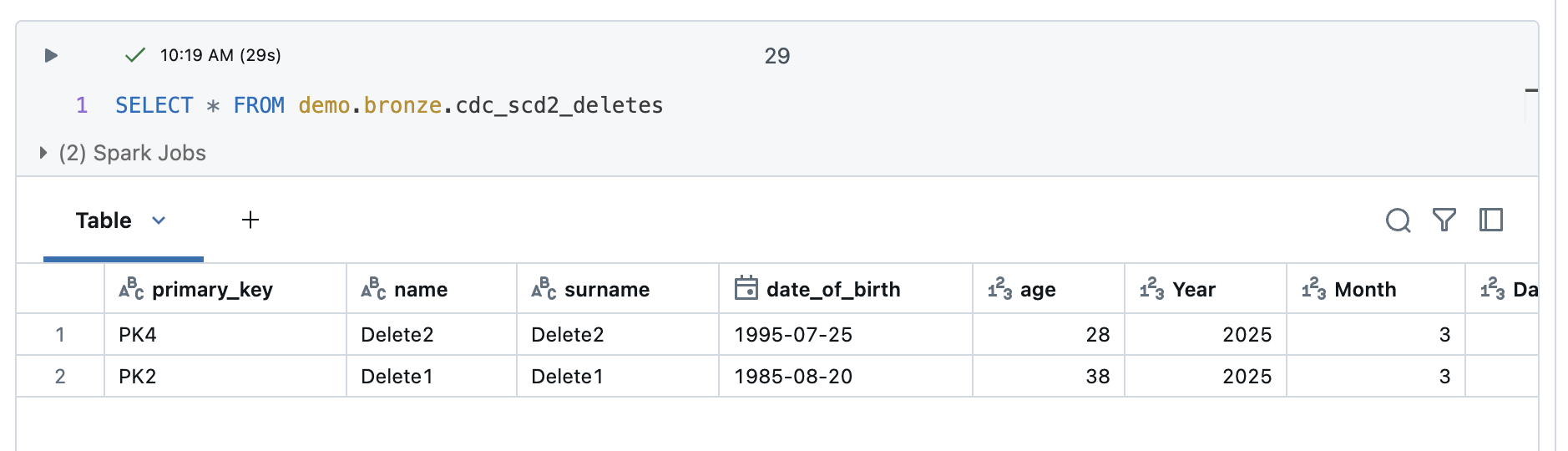 Theoretically, you could now adapt the DLT pipeline and add a second step in which the deleted records are detected with this query and then removed from the bronze table or at least flagged as deletes.