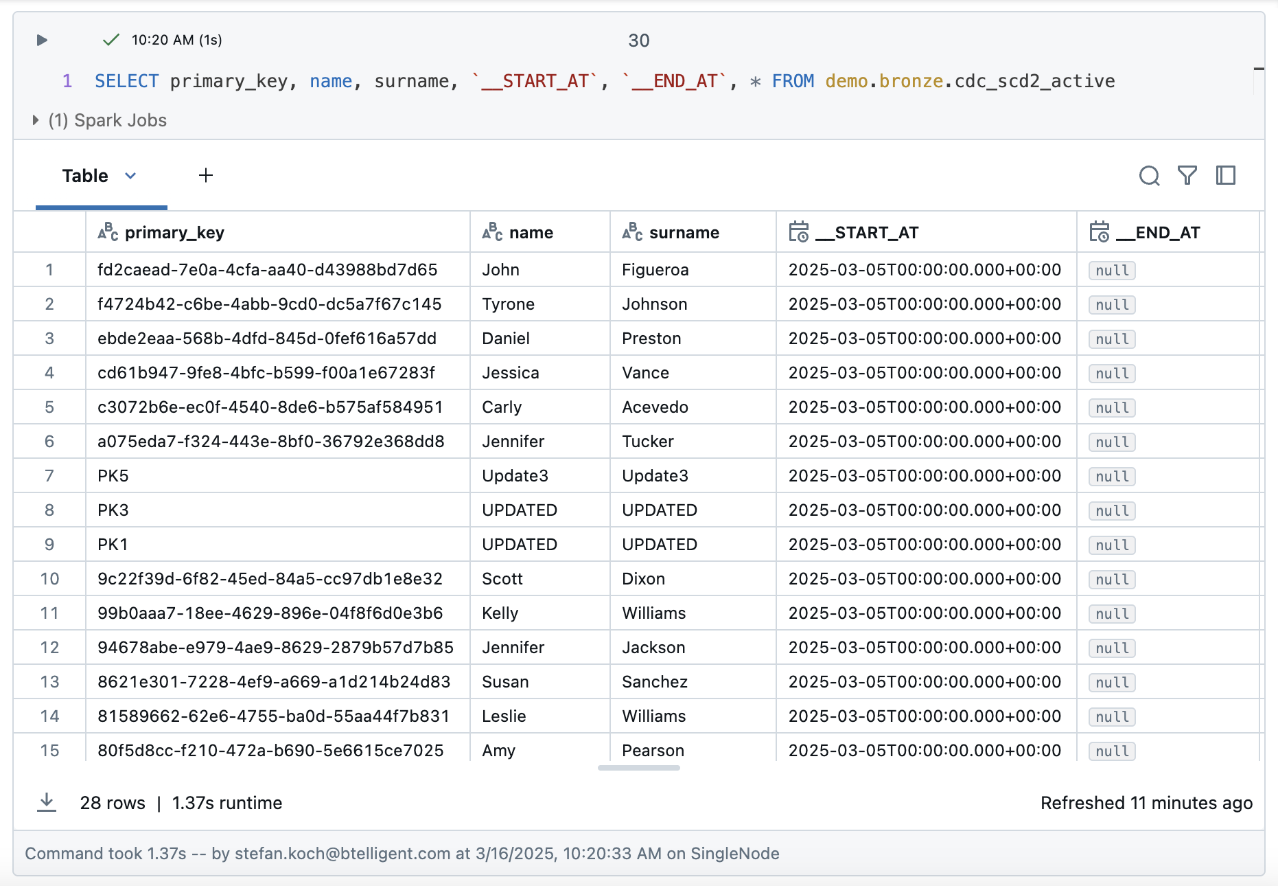 As is easy to see, we have a multiplication of the amount of data. It is also not clear when which record was loaded into the table. It is also not clear that the record with the primary key ‘PK1’ has changed. I set this in the first notebook so that the name and surname are changed.