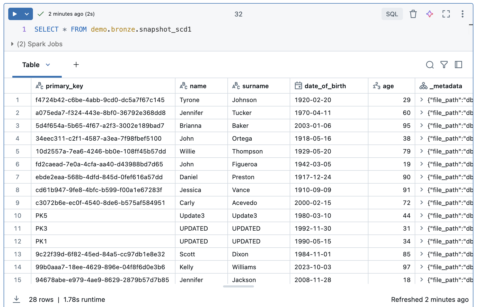Apply Changes From Snapshot SCD2: Here I have the complete historisation including delete detection. The ingestion is a bit more complex because you can’t use autoloaders, but the result is a single bronze table.