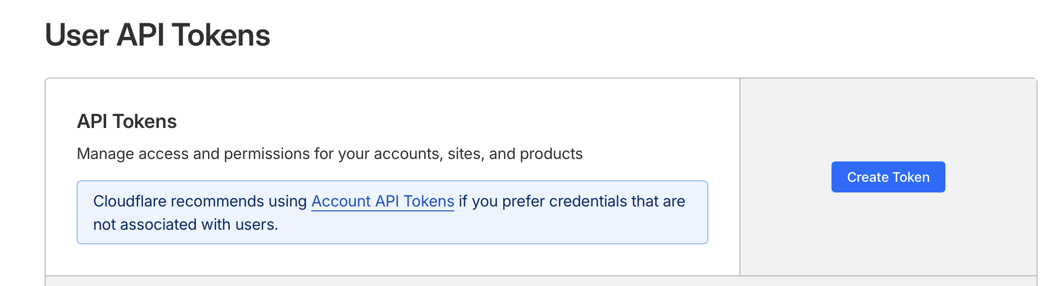 To be able to access Cloudflare via API later, I need an API token. I go to https://dash.cloudflare.com/profile/api-tokens and click on “Create Token”.