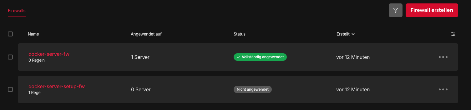 setupfirewall – Allows SSH (port 22), attached only during initial provisioningmainfirewall – Allows nothing (zero rules), this is our permanent “Zero Entry” state