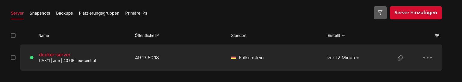 I chose the smallest instance (CAX11) for this guide, which is sufficient for a handful of lightweight containers. If you plan to run more or heavier services, you can easily scale up to larger instances like CAX21 or CAX31 – just change the server_type in the configuration.