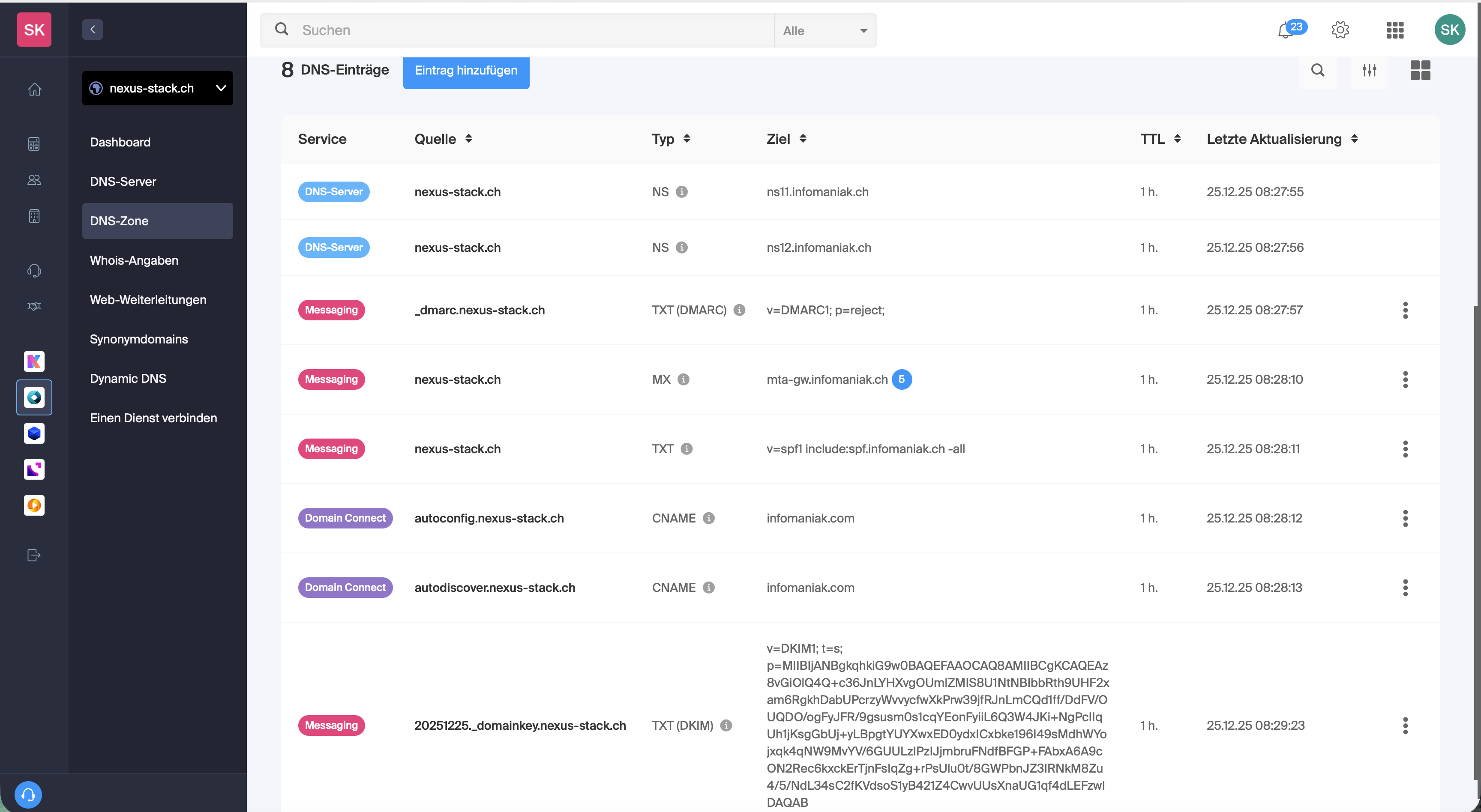 For my example, I purchased a Swiss domain called nexus-stack.ch. I usually register my domains at https://www.infomaniak.com/en, which offers good service and affordable domains. After the domain becomes active, the default DNS configuration points to my registrar’s DNS servers (Infomaniak).